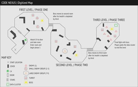 Overview: The player is an elite soldier sent to a secret laboratory to recover stolen data. The level begins with the player seeing the boss for the first time. The player will follow the boss and begin the fight. There are three prospect rooms the player will have firefights in. The boss will move to the next room each time his health is depleted by a third. The level ends after the player defeats the boss and collects the stolen data.