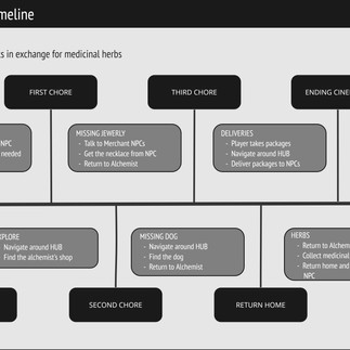 Overview: The player is a young tradeswoman. They live in a village just outside a castle and it serves as a junction point for several other roads. The level begins with the player learning they need a specific herb to help the player's father recover from an illness. The player then searches for the Alchemist, the only NPC in the village that has the herbs. The Alchemist will send the player to complete several tasks/chores before giving them the herbs. The player will return home with the herbs to complete the level.