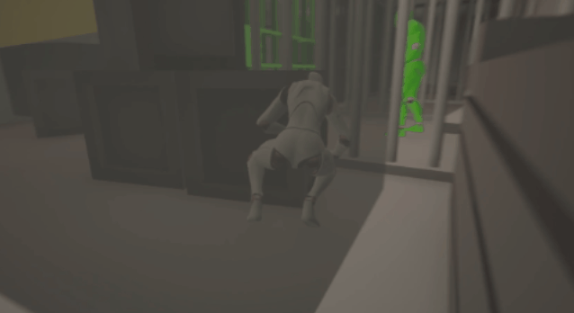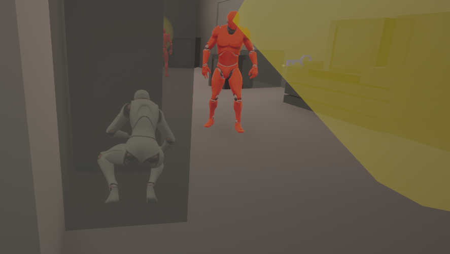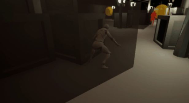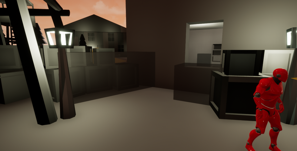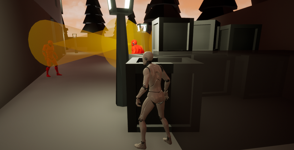 The main mechanic is stealth. I scripted the safe/cover locations, the enemies' vision cones, and a caught/safe indication from the player. There are several safe spots around the outpost, indicated by translucent black boxes. While the player is in one and crouched, they will not be seen by the enemy's vision cone. If the player is seen by the enemy, the level will restart.
